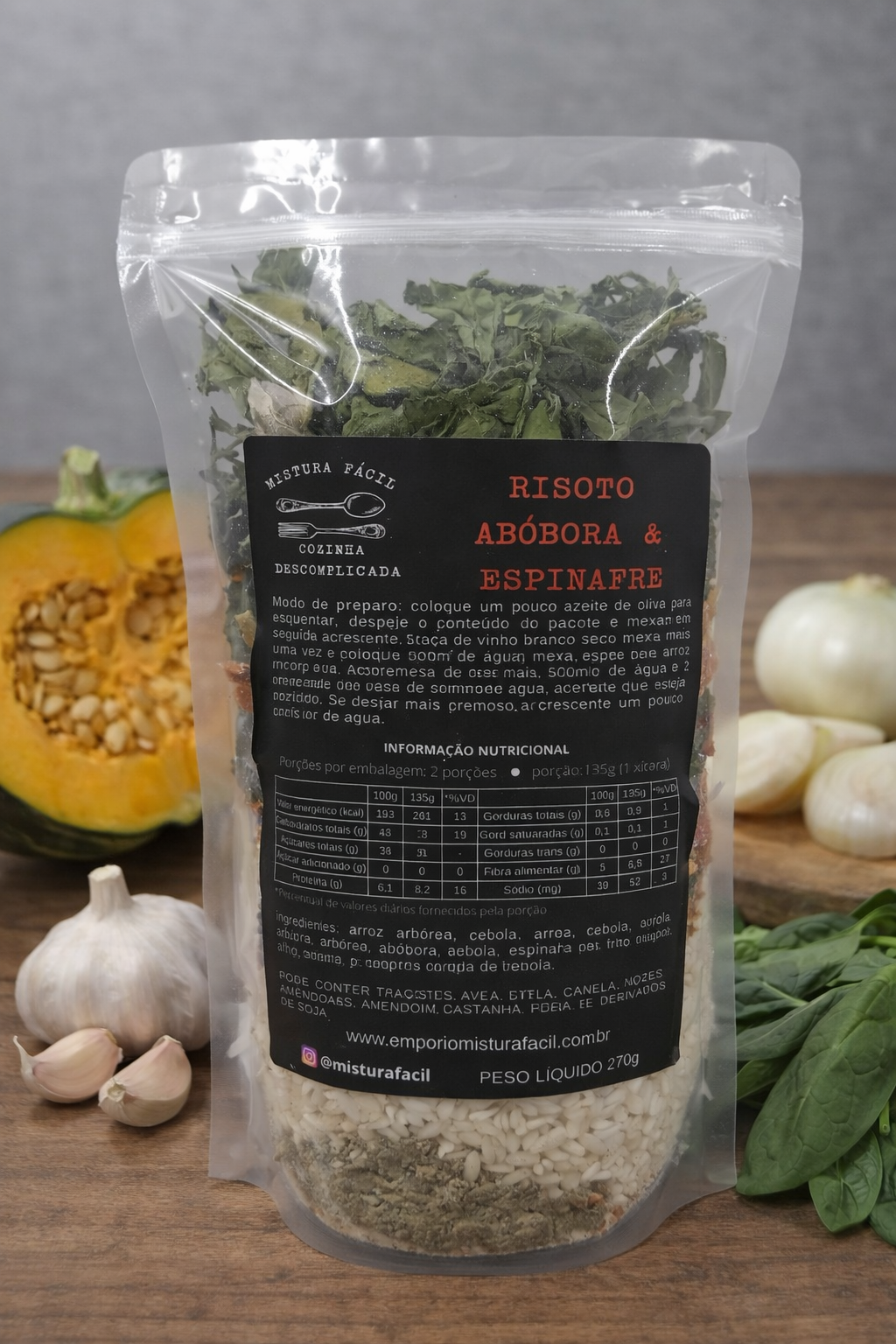 ingredientes: arroz arbóreo,abóbora, cebola desidratada, espinafre, alho frito, mirepoix (caldo de legumes natural)