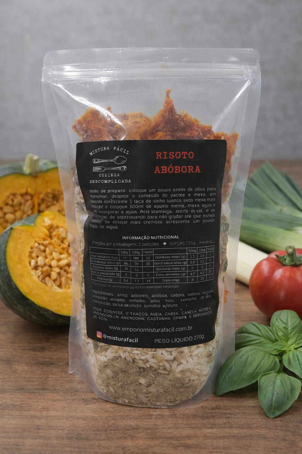 ingredientes: arroz arbóreo,abóbora, cebola desidratada, alho poró, pimentão vermelho, alho frito, semente de endro, manjericão, salsão, tomilho e louro.