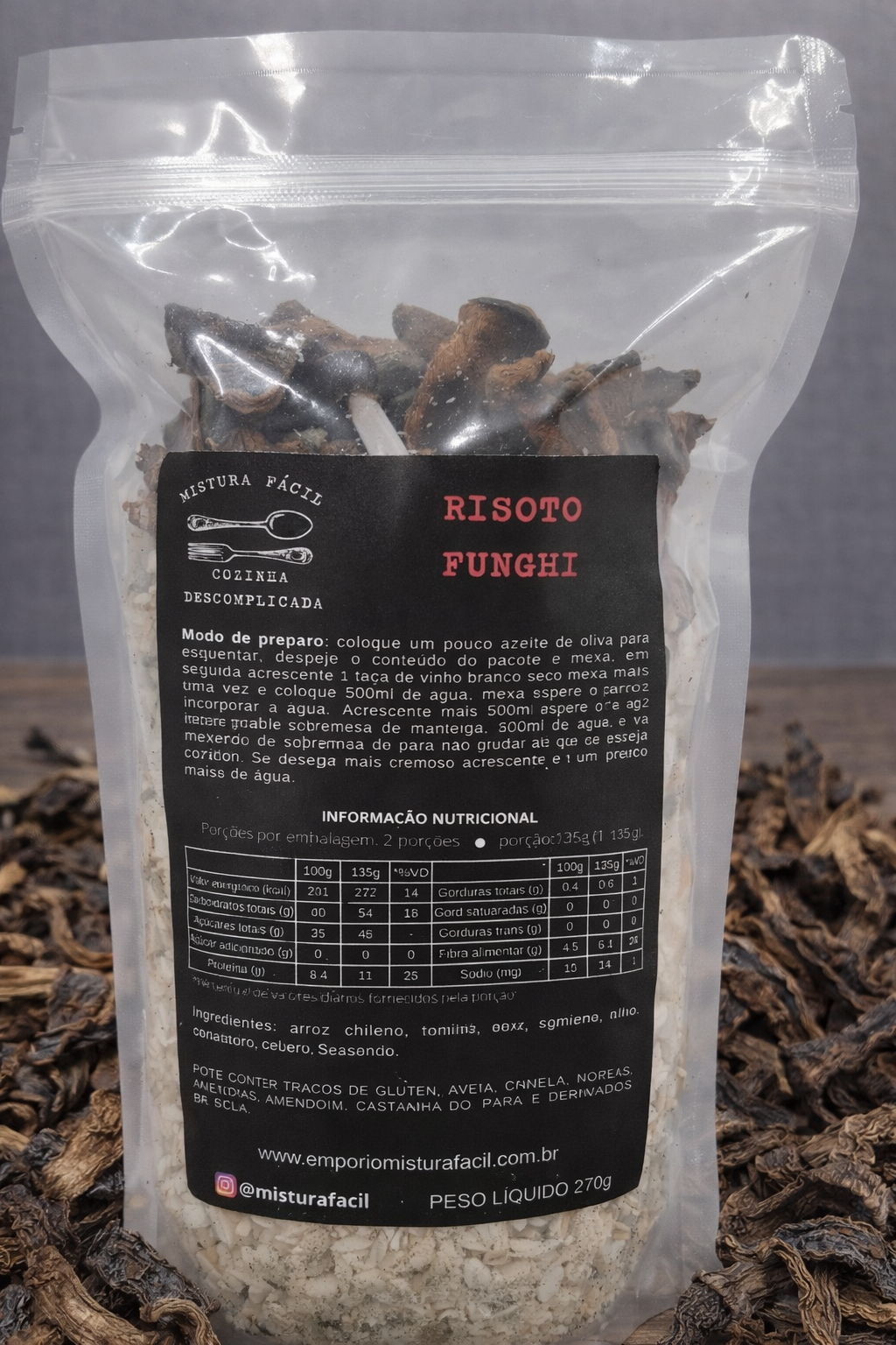 ingredientes: arroz arbóreo, funghi chileno, cebola desidratada, alho frito, semente de endro, salsão, tomilho e louro.