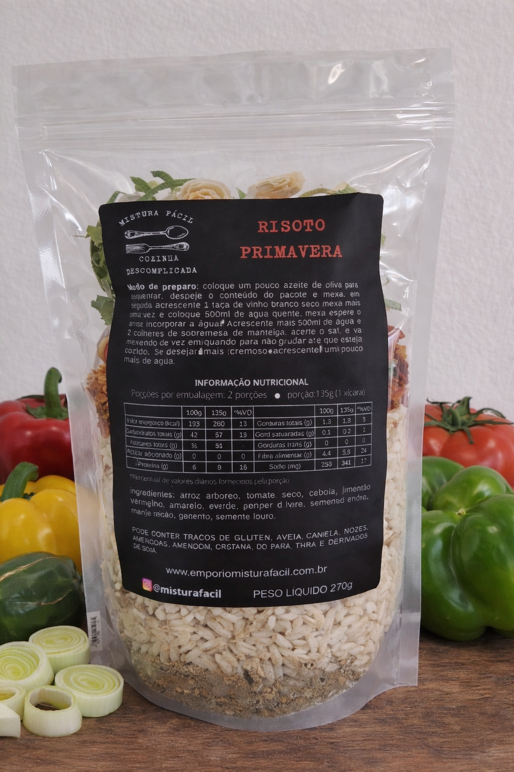 ingredientes: arroz arbóreo, tomate seco, cebola desidratada, pimentão vermelho, amarelo e verde, alho poró, semente de endro, manjericão, salsão, semente de coentro, tomilho e louro.