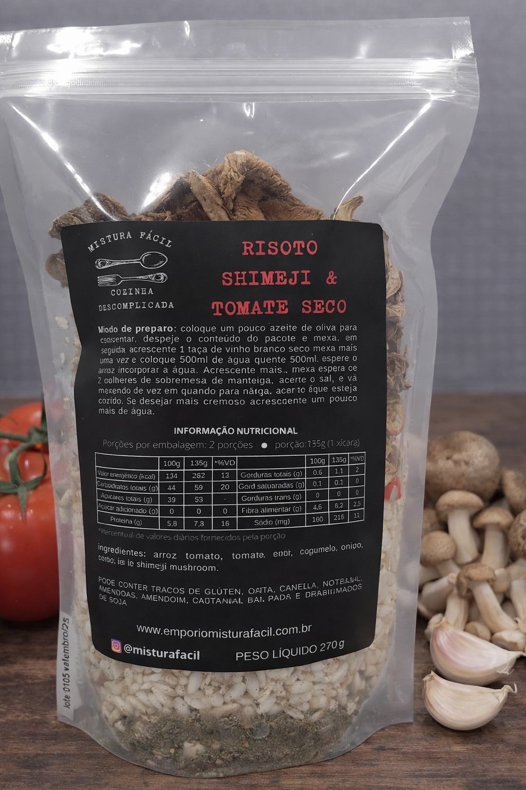 ingredientes: arroz arbóreo, cogumelo shimeji, tomate seco, cebola desidratada, pimentão verde, alho frito, semente de endro, manjericão, salsão e louro.